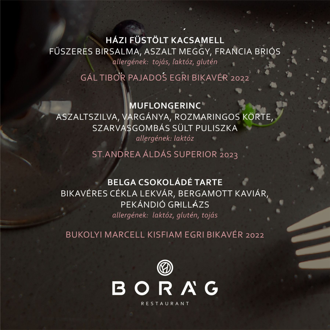 A város ikonikus borához méltó fogások ezúttal is a helyi alapanyagok és a letisztult tálalás találkozásából születtek meg – a cél, hogy minden falatban Eger íze és hangulata köszönjön vissza. A háromfogásos ajánlat minden eleméhez gondosan válogatott bikavér tételek társulnak, így a gasztronómiai és borélmény tökéletes harmóniában bontakozik ki.