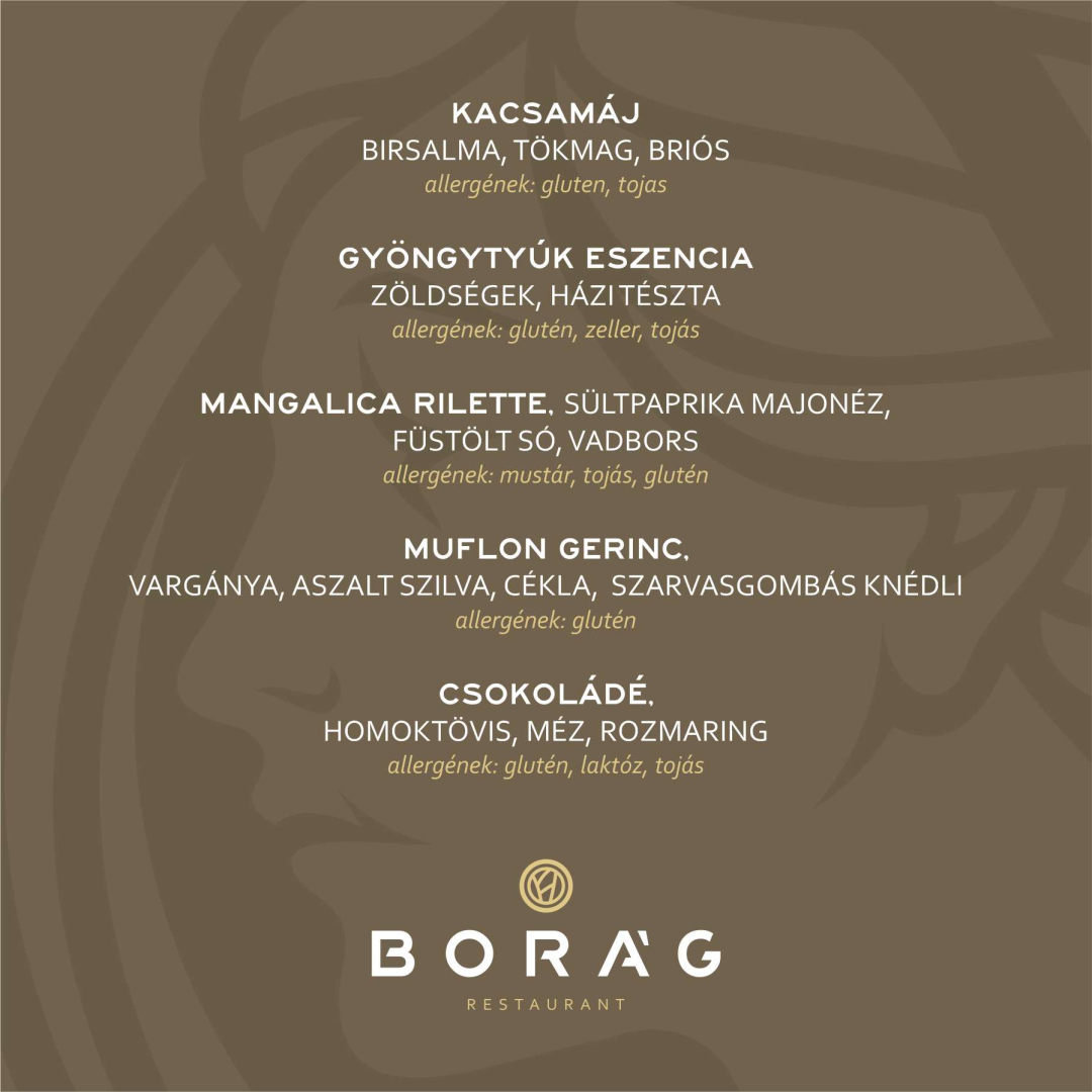 BORÁG éttermünk séfje, Kreácsik Ádám különleges 4+1 fogásos menüsort álmodott meg, amelyhez a St. Andrea borásza személyesen válogatott borokat társít.