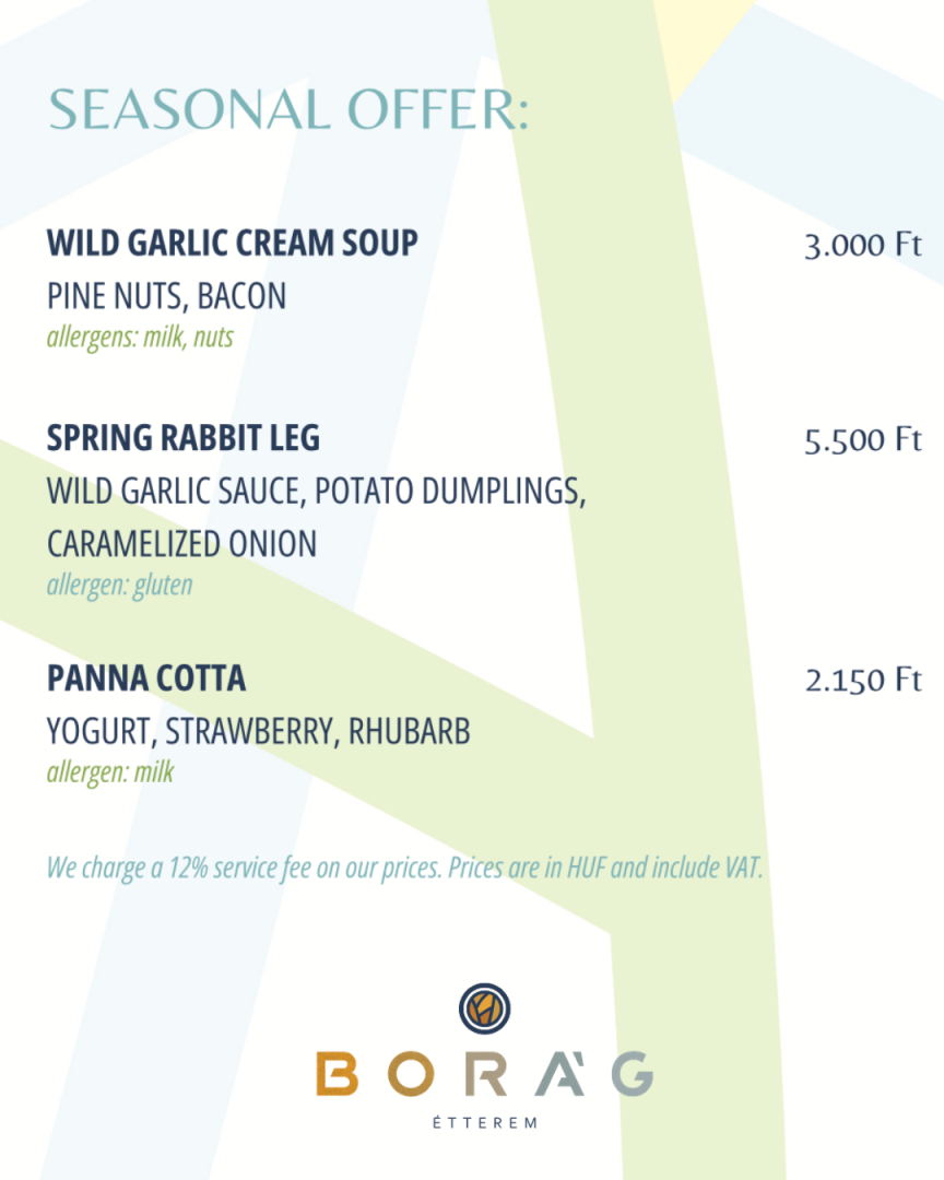 At lunchtime, every day between 12:00 and 17:00, we offer dishes to choose from a menu, made from fresh, seasonal ingredients. The lunch menu is clean, yet versatile: light dishes, vegetarian options, Hungarian classics and international inspirations are all included.