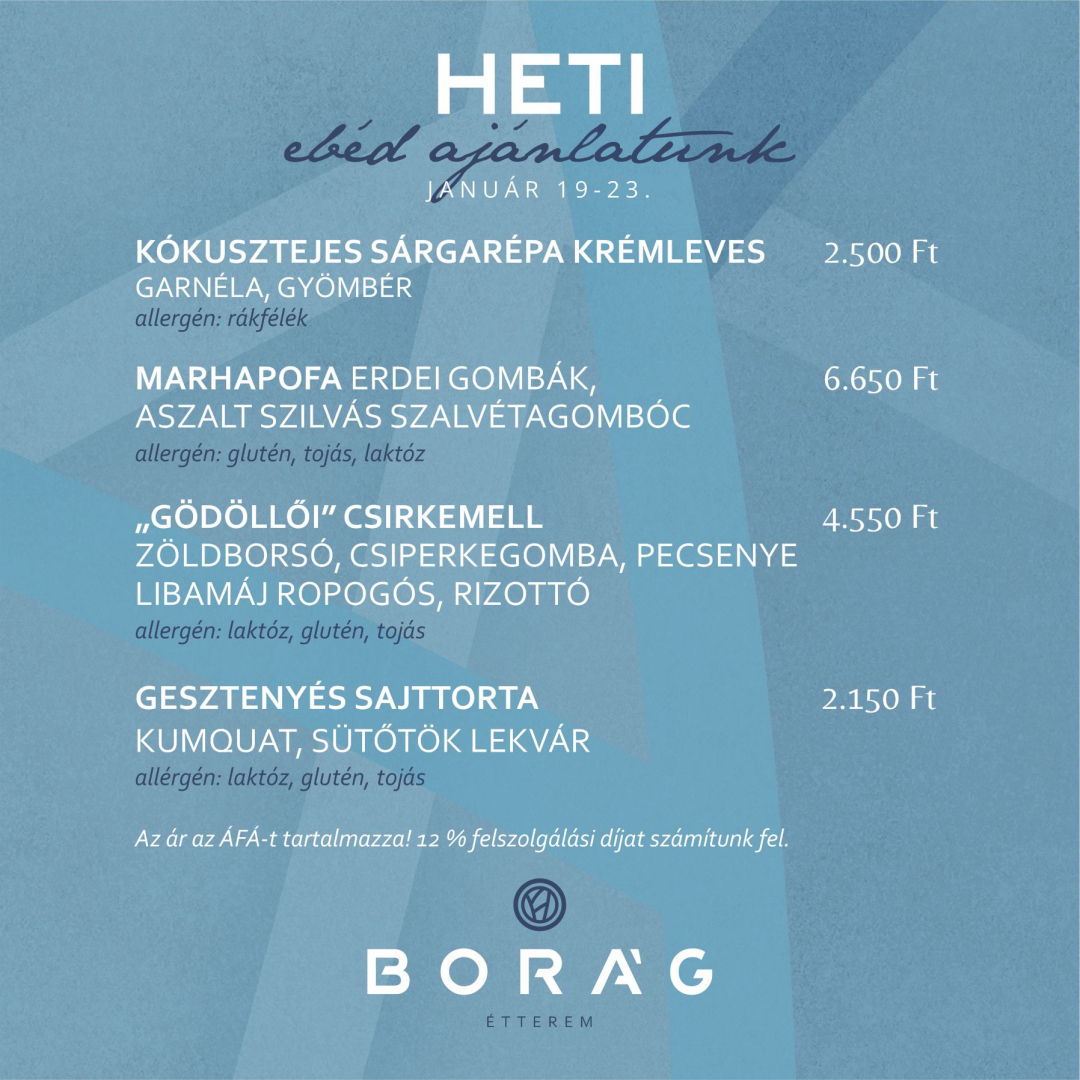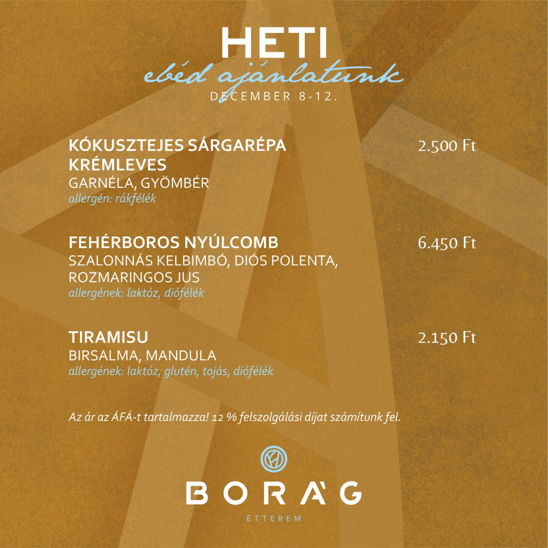 A BORÁG étterem vendégeinek hétfőtől péntekig heti menü ajánlattal kedveskedünk! A heti menüben szereplő ételek éttermünkben 10% kedvezménnyel érhetőek el a jelölt időszakban.