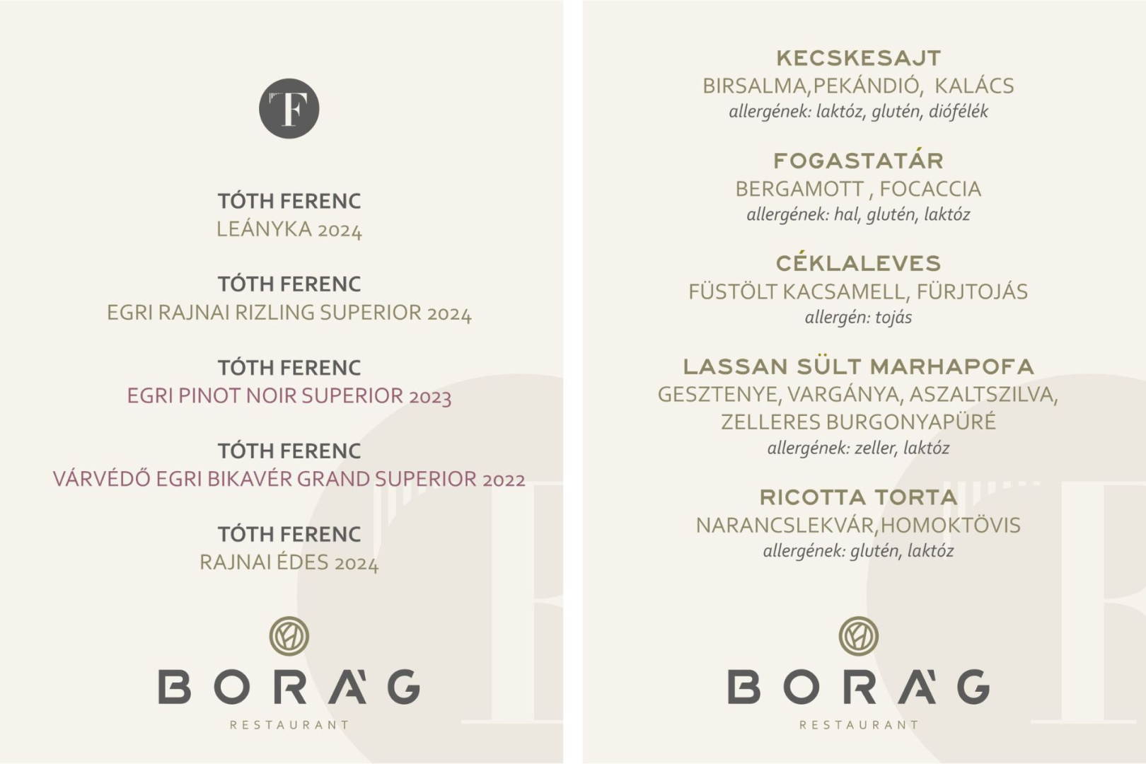 A BORÁG étterem séfje, Kreácsik Ádám ezúttal kifejezetten a Tóth Ferenc pincészet boraihoz hangolta 4+1 fogásos menüjét, melyet személyesen Tóth Katalin párosított össze a legmegfelelőbb borokkal, és természetesen mesélni is fog róluk a vacsoraasztalnál.